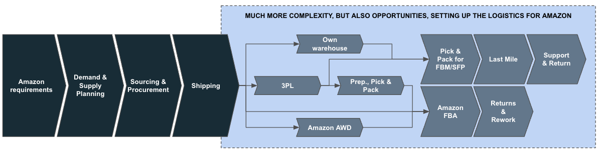 When a company sells goods through Amazon’s marketplace, logistics can operate in two primary ways: Fulfillment by Amazon (FBA) or Fulfillment by Merchant (FBM). The two different ways create different requirements on the logistics setup and how to operate this. The two models can also be combined, or alternated, even on a SKU level why there are numerous ways to design an optimal logistics setup. In addition to this, Amazon offers a lot other services related to logistics. For example, Amazon’s FBA model can be used for external D2C sales and Amazon even has its own 3PL service (Amazon Warehouse and Distribution) that is integrated with FBA but also possible to used for B2B sales. Navigating through all possible services can be complex but can save you a lot of money and headache in the end of the day!